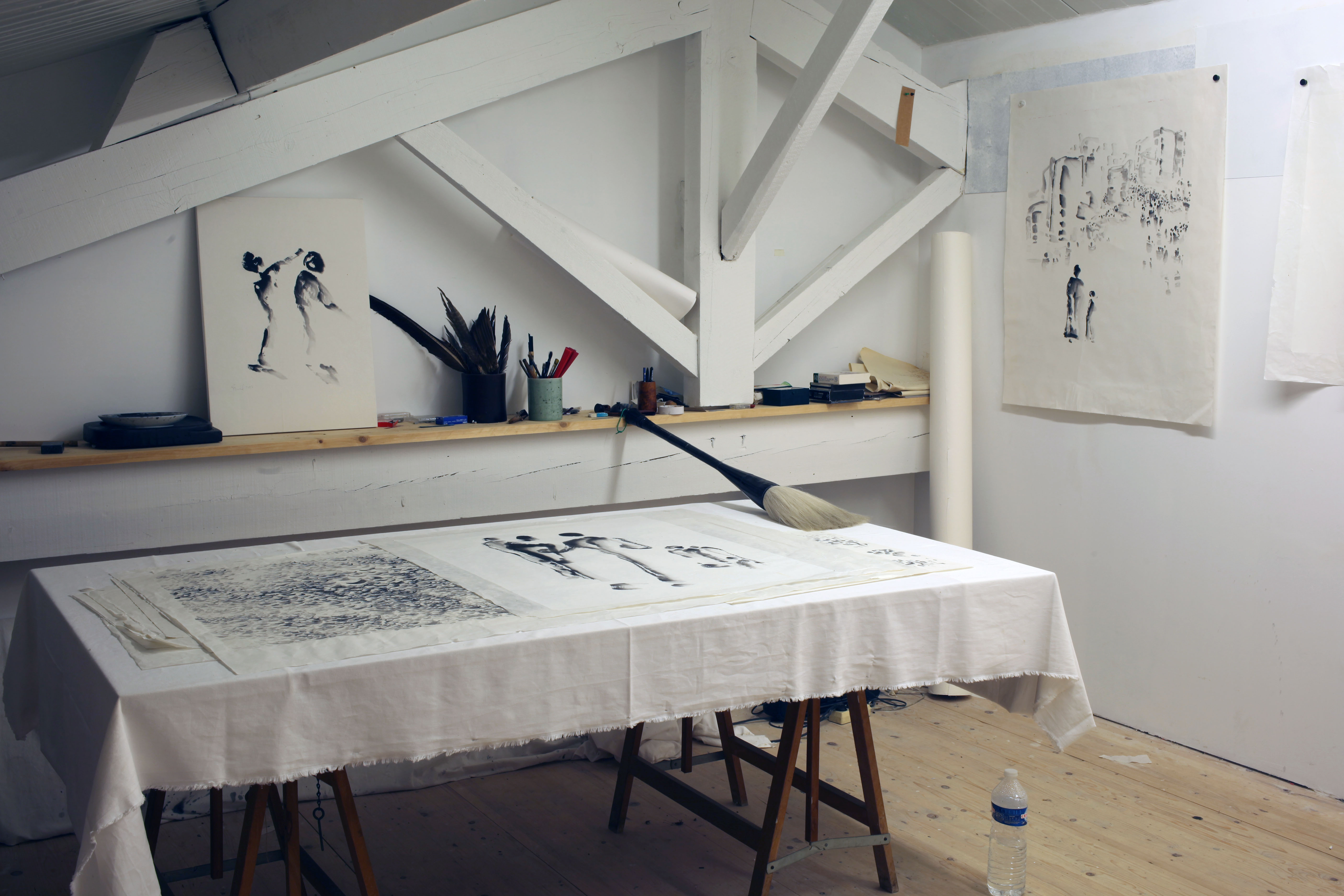 Sybille Friedel ne parle pas au nom des réfugiés, elle les accompagne de son langage pictural : des compositions naturelles, des couleurs discrètes, des traits à peine esquissés, un équilibre entre les vides et les pleins, les modulations du trait, le blanc et le noir. Pas de violence dans cette peinture-fleuve, qui se déroule lentement, inlassablement, inexorablement.